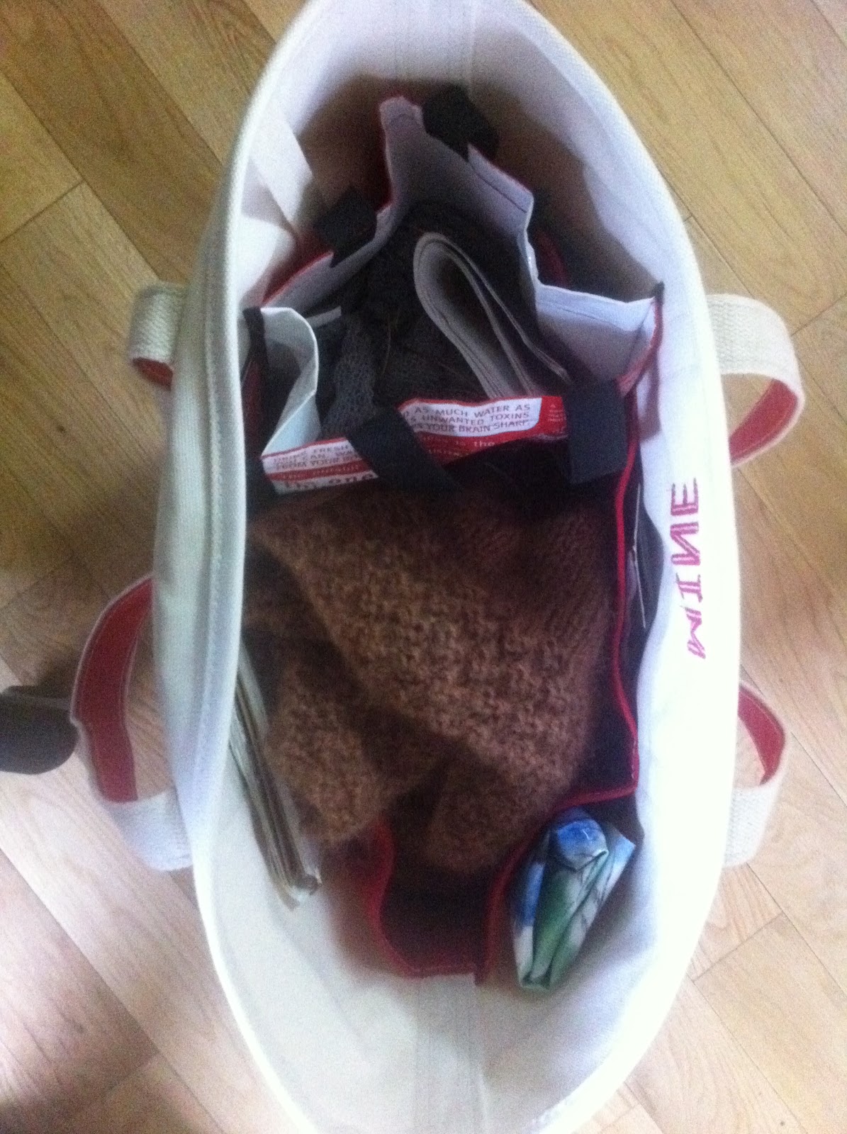 Whatever its intent, it is now my knitting notions kit. The bag I purchased needed to fit it. So I measured carefully. It sits neatly on the bottom, with a lulu-lemon bag (why else would I shop there other than to use the bags to fit smaller knitting projects?). The little bag holds my lace shawl I’m knitting, protecting it from the other stuff in the bag. My larger project (in this case the Victorian Throw I’m working on) takes up the rest of the space. Patterns and crochet and dpn kits sit in the interior side pockets with a notebook and more pens.